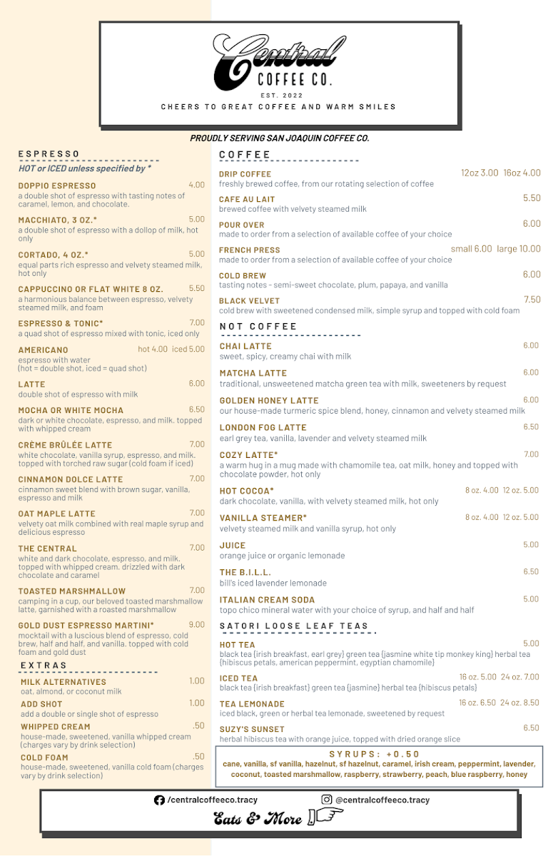 Welcome to Central Coffee Co., a charming gem located at 624 N Central Ave, Tracy, CA. This cozy coffee shop has a stellar menu that’s capturing the hearts of local coffee enthusiasts.